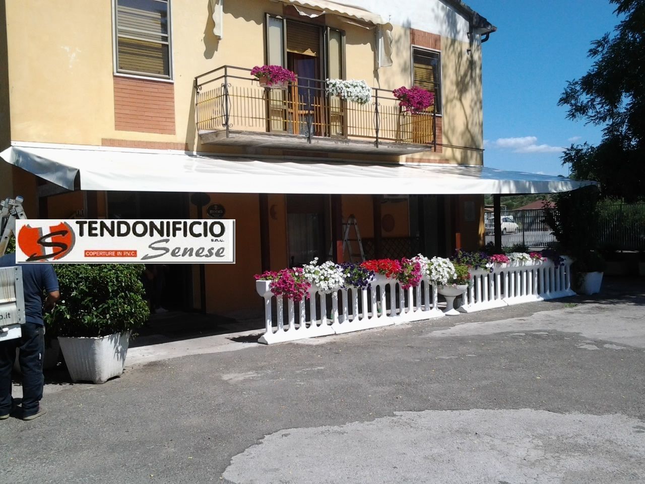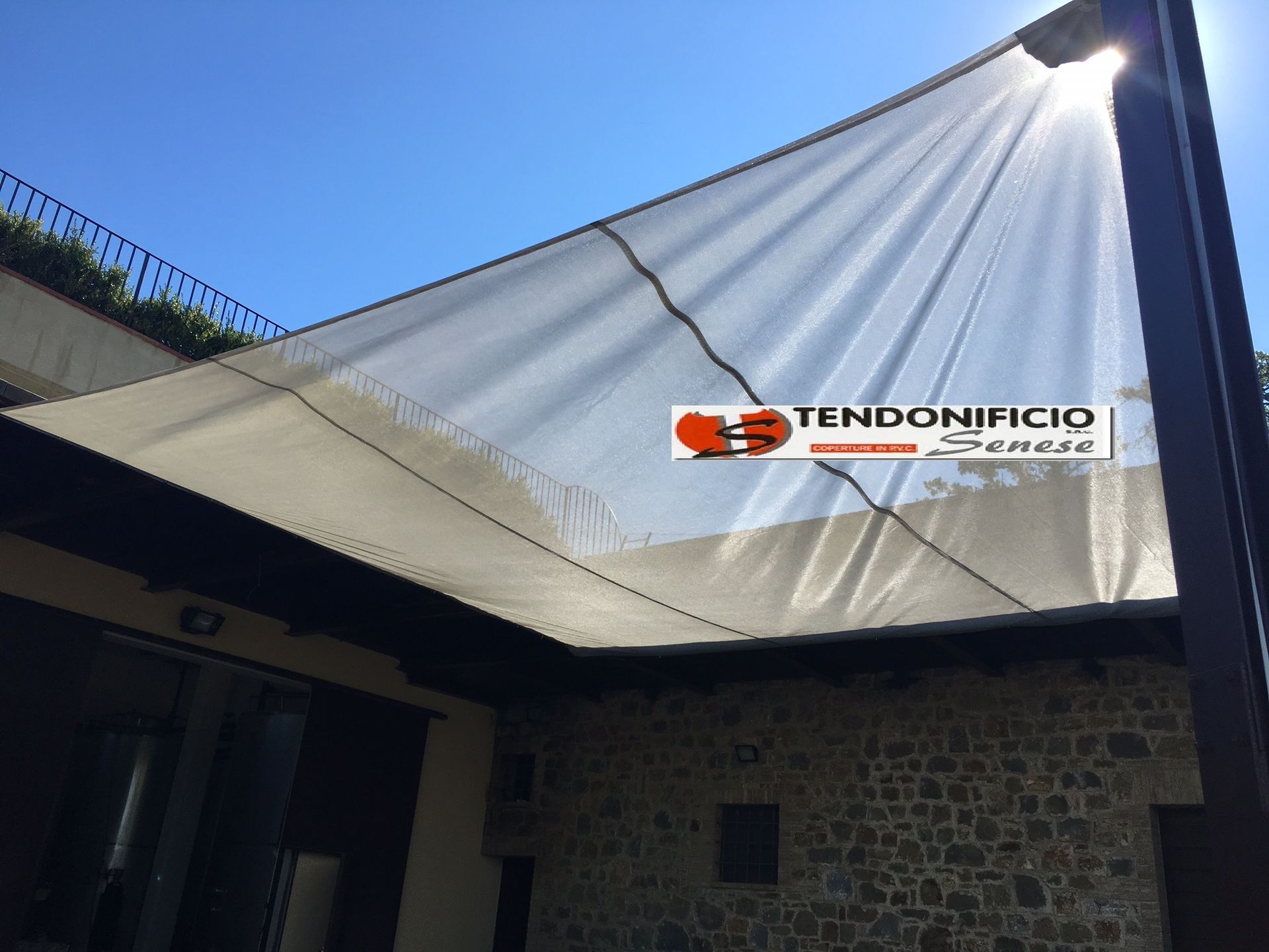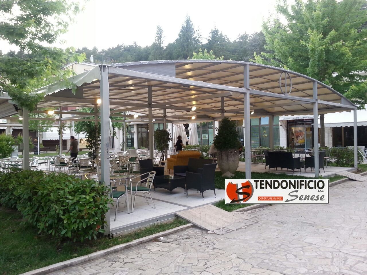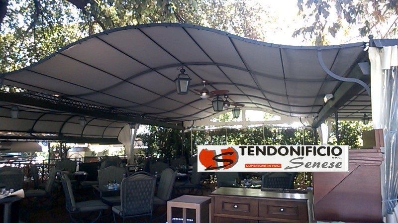 Il Tendonificio Senese di Monteroni d'Arbia si occupa, insieme alla produzione di teli sagomati per piscine, della realizzazione di teli di copertura per ristoranti e locali pubblici. Per questo tipo di produzione, disponibile con consegne in tutta Italia, vengono , impiegati tessuti ingnifughi certificati, con particolare cura nella scelta del colore del tessuto più idoneo al contesto. Oltre al tessuto PVC disponiamo di tessuti in rete ombreggiante. I teli di chiusura laterali in cristal trasparente consentono di realizzare ambienti completamente chiusi.